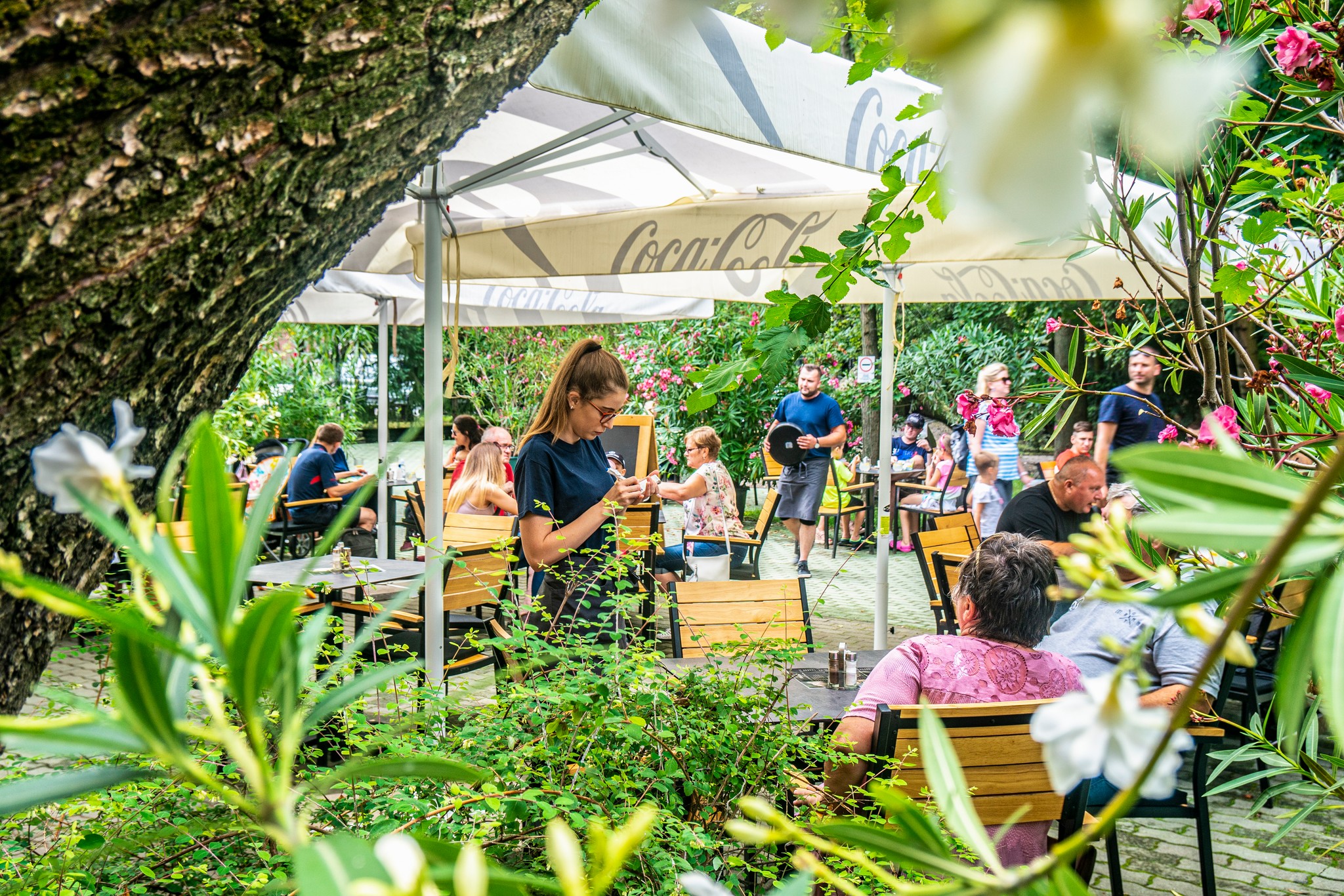 A főszezonban – március idusától egészen a vénasszonyok nyaráig – vendégeink a természet közelségét élvezve, az étterem hangulatos teraszán fogyaszthatják el fogásaikat. A lombkoronák között átszűrődő fény és az erdő nyugalma különleges atmoszférát teremt minden étkezéshez.